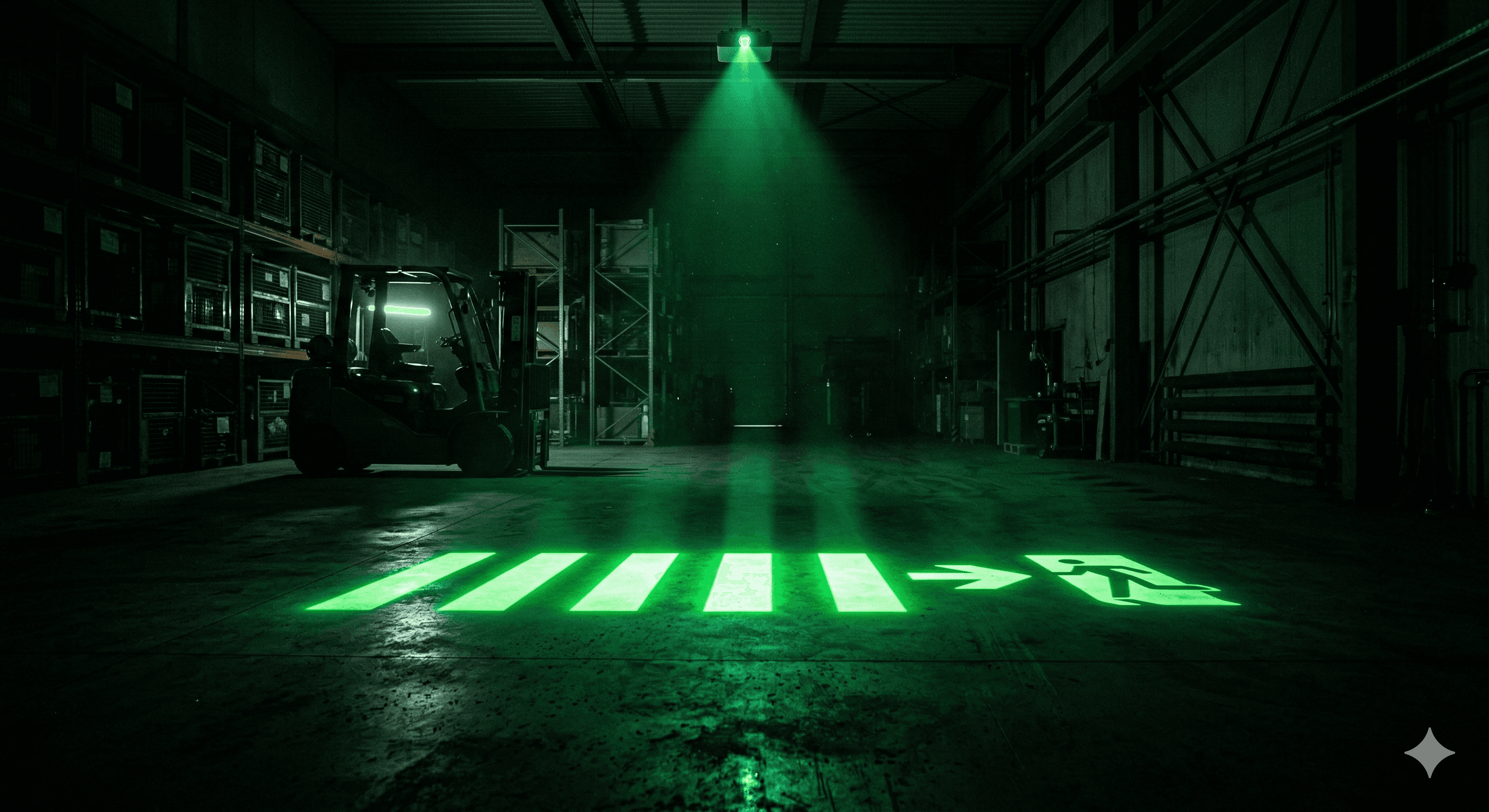¿Cambió el flujo de sus grúas horquilla? Ajuste el proyector o cambie el Gobo en 15 minutos. Sin raspar pisos, sin químicos, sin residuos. **Cero impacto en el pavimento.**